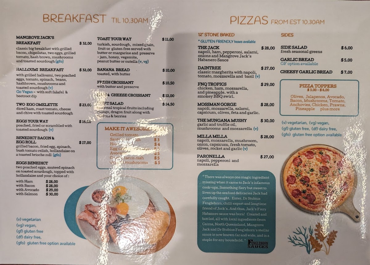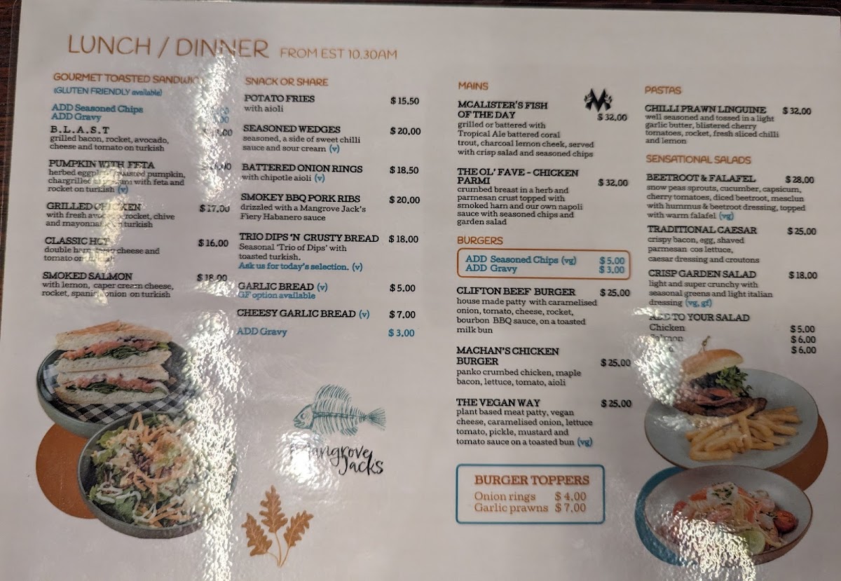 - Main Meals and Light Bites: Features burgers (chicken, beef), stone baked pizzas, fish of the day, chicken parmi, and smoked salmon dishes.